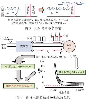 變頻器的輸出脈沖上升或下降時間很短,是疊加在變頻器輸出給電機的驅(qū)動頻率(基波)及脈沖調(diào)制頻率(調(diào)制波)之外的高頻成分。一般情況下,變頻器與電機連接電纜的阻抗ZL是50~100 贅,而電機本身的阻抗ZM,一般數(shù)百kW的電機也都超過1 k贅,是電纜阻抗的10 倍以上。這樣,在電機的接線端子上將發(fā)生阻抗的不匹配現(xiàn)象,造成高頻波成分的反射。在不匹配阻抗連接處的反射系數(shù)M為