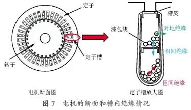 電機內(nèi)部的斷面如圖7 所示。電機有定子和轉(zhuǎn)子,定子內(nèi)有安放三相線圈的槽。如果放大槽的內(nèi)部,可以看到有許多的線圈(漆包線),各線圈對地之間、各相之間、線匝相互之間都有絕緣存在。通常對地、相間都有絕緣紙插入,而線匝之間沒有絕緣紙插入,它利用堅固的漆包線的漆層獲得絕緣。微浪涌電壓給這些絕緣全部帶來影響,這些絕緣損壞之中,線圈匝間損壞最多。表1 列出了有關(guān)電機內(nèi)部各絕緣部分承受的電壓值,也稱為電壓應(yīng)力,提供了用市電電源驅(qū)動電機和用變頻器驅(qū)動時相比較的資料。