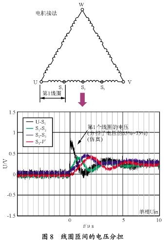 浪涌電壓滲入電機內(nèi)部的時候,線圈匝間究竟加上多少電壓,模擬結(jié)果如圖8所示。該模擬是將測量點放在電機的每一線圈上(電機槽內(nèi)的漆包線圈上),在U-V之間加上上升時間0.14 滋s 的浪涌電壓的測量的結(jié)果。U-S1之間是第1 線圈分擔(dān)的電壓,測得它分擔(dān)了全電壓65豫耀75%,而別的線圈S1-S2、S2-S3、S3-V 之間分擔(dān)了10豫耀20%,這是因為電機內(nèi)部的阻抗大,微浪涌電壓在逐漸衰減。