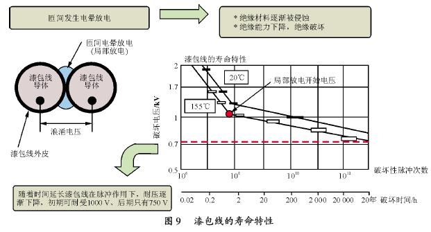 在電機的制造過程中,漆包線線圈的起頭到末尾完全分離不易做到,多數(shù)情況下是亂繞的,槽里邊線頭和線尾可能緊挨著。如果這樣就會發(fā)生線匝之間由于微浪涌電壓的電暈放電(局部放電)。那怕放電部分時間極其短促,局部也會達到10 000益,高溫使絕緣逐漸地侵蝕,過些時間之后絕緣就會被破壞。如圖9 所示為直徑0.85 mm、漆皮厚33 滋m、F 級絕緣、155益漆包線的壽命特性。