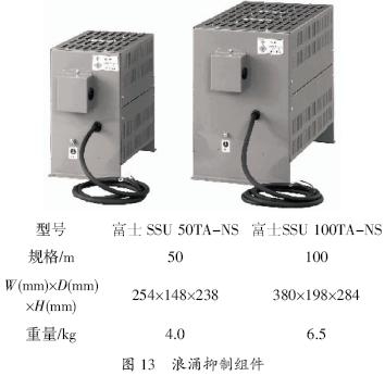 圖13 所示為浪涌抑制組件的外觀。和輸出濾波器相比,浪涌抑制組件是小型化的產(chǎn)品。其技術(shù)指標(biāo)為相間的微浪涌電壓1 000 V以下,防護等級為IP20。浪涌抑制組件是對變頻器的容量不需要選擇,而接線距離需要選擇的產(chǎn)品。另外,接線方法非常簡單,只需要把浪涌抑制組件的輸入電纜接到電機接線端子U、V、W上。