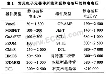 (2)靜電釋放(ESD)破壞,造成電子元件不能工作。表1列出了一些常見電子元器件所能承受靜電破壞的靜電電壓,從表中可以看出大部分器件的靜電破壞電壓都在幾百至幾千伏,而在干燥的環(huán)境中人活動(dòng)所產(chǎn)生的靜電可達(dá)幾千伏到幾萬(wàn)伏。圖2是一個(gè)CMOS器件和一個(gè)雙極型器件在受到ESD損傷后芯片內(nèi)部的相貌像;