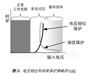 電壓箝位與消?。弘妷后槲黄骷墓ぷ髟硎菑牡碗妷簳r(shí)的高阻抗轉(zhuǎn)換至高于導(dǎo)通電壓時(shí)的低阻抗,且沒有負(fù)阻抗區(qū)域(圖2)。這器件通過提供接地的低阻抗通道,對(duì)高于導(dǎo)通電壓的電壓進(jìn)行箝位。消弧(crowbar)器件在低電壓時(shí)也呈高阻抗,但當(dāng)電壓較高時(shí)觸發(fā)新的導(dǎo)通機(jī)制,使電流增大,并伴隨著電壓下降。因此,消弧器件擁有負(fù)阻抗區(qū)域。某些消弧器件的觸發(fā)電壓可能非常高。如果消弧TVS觸發(fā)器的速度足夠快,就可以經(jīng)常提供保護(hù),即便電壓已經(jīng)達(dá)到可能導(dǎo)致器件損壞的電平。消弧器件有時(shí)也稱作“驟回”器件,因?yàn)殡妷后E然下降。