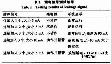 為了測(cè)試需要,我們?cè)O(shè)計(jì)了一個(gè)信號(hào)源,可以按照系統(tǒng)檢測(cè)信號(hào)的要求產(chǎn)生脈沖信號(hào),以脈沖信號(hào)來模擬漏電信號(hào)。設(shè)定緩變電流動(dòng)作值為100 mA,突變電流動(dòng)作值為8 mA,當(dāng)緩變電流累計(jì)值達(dá)到90 mA時(shí),測(cè)試結(jié)果如表1所示。