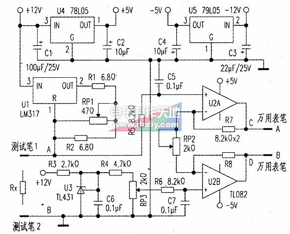 由運(yùn)算放大器U2A和U2B及R7、R8、RP2(精密電位器)構(gòu)成電壓放大電路,對(duì)被測(cè)電阻兩端的電壓進(jìn)行10倍放大,這樣數(shù)字萬(wàn)用表從C、D兩點(diǎn)測(cè)得的電壓值就可以與被測(cè)電阻RX的阻值相對(duì)應(yīng)(1mV對(duì)應(yīng)1mΩ,1V對(duì)應(yīng)1Ω)。