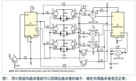 電路使用兩只CD4022或CD4017計(jì)數(shù)器IC1和IC2;一只單門方波振蕩器G4;以及一個(gè)CD4011四與非門,G1至G3。每個(gè)測(cè)試端子串接一對(duì)LED,用于指示電流的方向。LED的顏色直接表示出晶體管的結(jié)端。