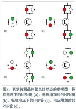 當(dāng)一只正常晶體管插在測(cè)試端子之間時(shí),它限制電流只能沿某些方向流動(dòng)。串聯(lián)的LED表示出這些方向,因此指示出了晶體管的類型。例如,對(duì)NPN晶體管,LED發(fā)光為紅-綠-紅;而對(duì)PNP晶體管,發(fā)光為綠-紅-綠。
