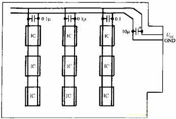 在單片機(jī)測(cè)控系統(tǒng)中使用了大量的數(shù)字IC,而每片數(shù)字IC本身都是一個(gè)脈沖干擾源,它們也會(huì)通過(guò)電源線相互干擾。解決辦法是在印制板電源進(jìn)線端并聯(lián)一只10UF~100UF鉭電容進(jìn)行電源退耦,同時(shí)在每個(gè)芯片的電源進(jìn)線端再并聯(lián)一只高頻、低分布的電感的陶瓷電容,容量一般取0.1UF,當(dāng)頻率超過(guò)15MHZ時(shí),可取0.01JF,電路如圖所示。退耦電容的引腳要盡量短。