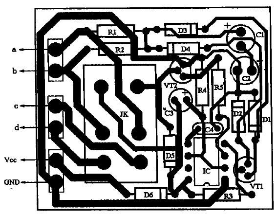 具體制作如下:先把功放輸出端與音箱的引線切斷,按圖2所示電路將引線頭a、b分別接功放的兩組輸出端,c、d分別接左、右聲道音箱:揚(yáng)聲器保護(hù)電路的電源只能從收放機(jī)中獲取,不可直接從汽車12 v電源中獲取,否則不起開/關(guān)機(jī)保護(hù)作用;若是柴油車所配置的收放機(jī)(使用24 V電源),則要求增加一個(gè)降壓電路(見圖3所示),給揚(yáng)聲器保護(hù)電路供電,以免電源電壓過高損壞IC。