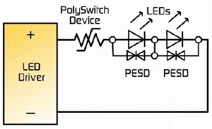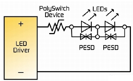如圖1所示,PolySwitch LVR元件可以同電源輸入串聯(lián)安裝,以幫助避免由短路,超載電路或者用戶濫用所造成的破壞。此外,橫置于輸入端的金屬氧化物變阻器(MOV)幫助在LED模型中提供過壓保護(hù)?! ?br />