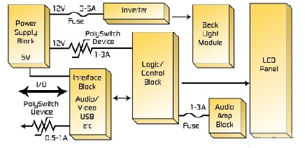 圖3顯示了在LCD電視監(jiān)測器中PolySwitch元件可以安放的位置,以幫助提供過電流保護(hù)。為了充分發(fā)揮PolySwitch元件的影響,可以將其和金屬芯電路板或者LCD散熱片熱結(jié)合在一起。如果LCD沒有內(nèi)置的ESD保護(hù),可以向ESD并聯(lián)一個PESD保護(hù)元件,以幫助避免由ESD電壓浪涌造成的破壞。