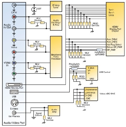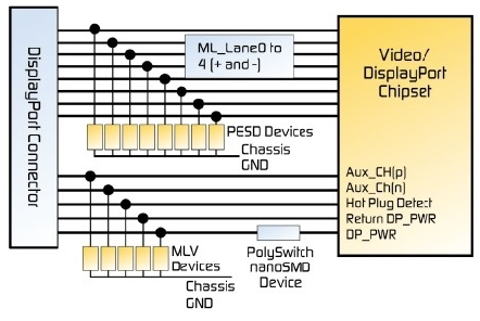 圖4. 典型的運用MLV元件, PESD抑制元件以及PolySwitch過電流保護(hù)元件的顯示端口電路保護(hù)設(shè)計