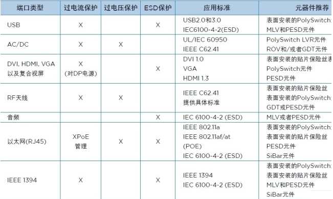 對LCD電視的界面的故障保護(hù)有明確地要求,包括有涉及各種故障保護(hù)需求的具體的標(biāo)準(zhǔn)。圖片7總結(jié)了這些標(biāo)準(zhǔn)以及對每一種端口類型所建議的電路保護(hù)設(shè)備。