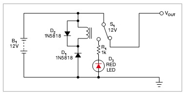 這個方法是用一只繼電器來處理反極性電壓問題。例如,12V供電系統(tǒng)使用12V的繼電器。當(dāng)為電路施加正確極性時,D1為反偏,繼電器S1保持關(guān)閉狀態(tài)。則輸入和輸出電源線正常連接到繼電器的端子,電流就流到最終電路上。二極管D1阻擋了繼電器的供電,防止電路耗電。