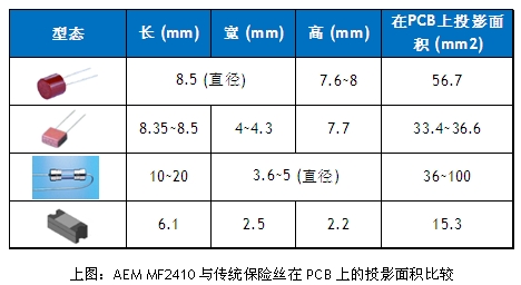 AEM科技研發(fā)生產(chǎn)的MF2410通用模塊式貼片保險(xiǎn)絲體積只有6.1×2.5x2.1mm,與傳統(tǒng)保險(xiǎn)絲相比,在PCB上的占用面積可以減少50-80%。