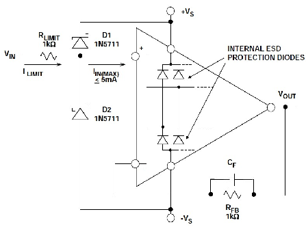 應(yīng)用這些保護器件時必須謹慎。某些二極管可能有嚴重泄漏,額外的漏電流最終會變成運算放大器的偏置電流。某些二極管可能還有相當大的電容,這可能會限制頻率響應(yīng),對高速放大器的影響尤為嚴重。此外,外加限流電阻RLIMIT會增加噪聲。