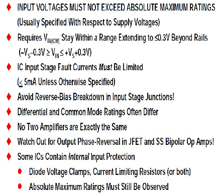 雖然可能存在一些例外,但務(wù)必注意:當發(fā)生超出電源軌0.3 V以上的過壓狀況時,多數(shù)IC運算放大器需要輸入保護?! ?br />