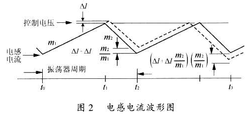 在圖l所示的電路中,當(dāng)電源的占空比大于50%,或變壓器工作在連續(xù)電流條件下時(shí),整個(gè)電路就會(huì)產(chǎn)生分諧波振蕩,引起電源輸出的不穩(wěn)定。圖2表示了變壓器中電感電流的變化過程。沒在t0時(shí)刻,開關(guān)開始導(dǎo)通,使電感電流以斜率m1上升,該斜率是輸入電壓除以電感的函數(shù)。t1時(shí)刻,電流取樣輸入達(dá)到由控制電壓建立的門限,這導(dǎo)致開關(guān)斷開,電流以斜率m2衰減,直至下一個(gè)振蕩周期。如果此時(shí)有一個(gè)擾動(dòng)加到控制電壓上,那么它將產(chǎn)生一個(gè)△I,這樣我們就會(huì)發(fā)現(xiàn)電路存在著不穩(wěn)定的情況,即在一個(gè)固定的振蕩器周期內(nèi),電流衰減時(shí)閘減少,最小電流開關(guān)接通時(shí)刻t2上升了△I+△Im2/m1,最小電流在下一個(gè)周期t3減小到(△I+△Im2/m4)(m2/m1),在每一個(gè)后續(xù)周期,該擾動(dòng)m2/m1被相乘,在開關(guān)接通時(shí)交替增加和減小電感電流,也許需要幾個(gè)振蕩器周期才能使電感電流為零,使過程重新開始,如果m2/m1大于l,將會(huì)不穩(wěn)定。因此,圖l所示的電路在某狀態(tài)下存在著一定的失穩(wěn)隱患?! ?/p>