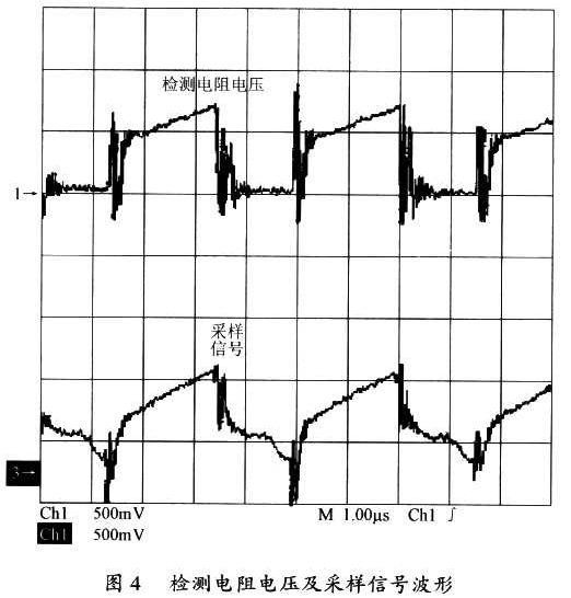 圖4給出了UC3842檢測電阻的電壓波形和采樣信號(hào)波形。從圖4中可以看出,經(jīng)過改進(jìn)后的電路,其采樣信號(hào)的波形緊緊跟隨檢測電阻的電壓波形,沒有出現(xiàn)非常大的尖峰電壓。因此,該電路能有效避免因變壓器漏感等異常干擾引起的電源誤操作的問題,也能有效避免因電源占空比過大而引起的系統(tǒng)不穩(wěn)定的問題。