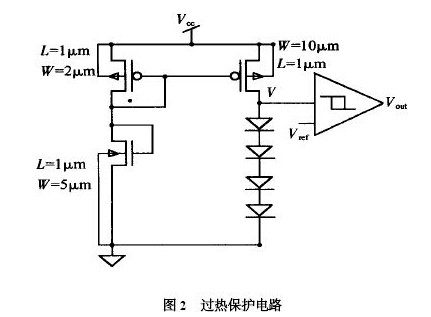 至于遲滯比較器的設計,在此不多贅述, 。不過建議使用模擬式的,數(shù)字式的施密特觸發(fā)器雖然也有滯回曲線,但調(diào)試起來比較困難,因為施密特觸發(fā)器的上跳變點V T + 和下跳變點V T - 都和閾值電壓V TH有關(guān),而V TH是隨著溫度的變化而變化的。而模擬式的遲滯比較器的回差電壓值只和參考電壓和內(nèi)部MOS 管的尺寸有關(guān),和溫度無關(guān),容易調(diào)節(jié)。過熱保護電路的方框圖如圖2 所示。