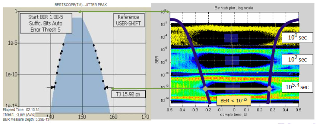 圖2 左面BERT 抖動(dòng)峰值與右面示波器抖動(dòng)浴缸之間的BER性能等效圖