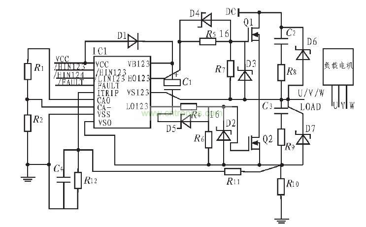 圖2中HIN1~HIN3、LIN1~LIN3:逆變器上橋臂和下橋臂功率管的驅動信號輸入端,低電平有效。CA-、CAO、VSO:內部放大器的反相端、輸出端和同相端,可對主電路的電流進行檢測。ITRIP:過流信號檢測輸入端,可通過輸入電流信號來完成過流或直通保護。FAULT:過流、直通短路、過壓、欠壓保護輸出端,該端提供一個故障保護的指示信號。它在芯片內部是漏極開路輸出端,低電平有效。VB1~VB3:是懸浮電源連接端,通過自舉電容和快速恢復二極管為3個上橋臂功率管的驅動器提供內部懸浮電源,其中快速恢復二極管的作用是防止母線電壓倒流損壞器件,VS1~VS3是其對應的懸浮電源地端。HO1~HO3、LO1~LO3:逆變器上下橋臂功率開關器件驅動器信號輸出端?! ?br />