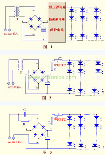 如果用WHPTC過流保護器作保護,將是另外一種結(jié)果,從原理可知,當電路的電流超過規(guī)定值時會訊速的自動保護,在排除故障后又自動復(fù)位,無需人工更換。對LED而言,電壓的變化不是LED損壞的直接原因,而電流的增大才是LED的真正殺手。顯而易見,利用WHPTC的這個特性,在LED的電路保護上具有絕對的優(yōu)勢,讓簡易電源供電變?yōu)楝F(xiàn)實。實踐證明,在LED電路出現(xiàn)故障以前就有效保護了。在簡易電源上,這個優(yōu)勢特別突出。對如下3圖分析可見,因有了WHPTC后可省去恒流、恒壓電路, LED的質(zhì)量也提高了。器件成本、生產(chǎn)成本、故障率、服務(wù)成本等,都大大降低。也大大增加了產(chǎn)品的市場競爭力。所以誰先使用WHPTC,誰先占領(lǐng)市場。