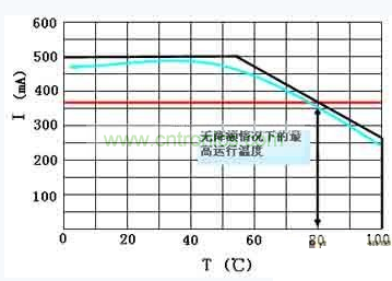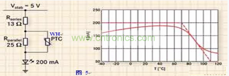由于LED電流的絕大部分流經(jīng)PTC熱敏電阻本身,因此需要選擇一個較大的徑向引線式元件。PTC將因為流經(jīng)電阻本身的電流而導(dǎo)致發(fā)熱,因此會一直減少電流,無論環(huán)境溫度為何(如圖5所示)。并聯(lián)兩個或更多片式PTC熱敏電阻會將電流分流,但此方案仍存在局限性。