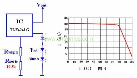 圖2所示電路2為另一常見的恒流源電路:電流通過連接驅(qū)動IC的電阻得以確定。然而在這種情況下,調(diào)節(jié)電阻并未與LED串聯(lián)。Rset和ILED之間的比率由IC規(guī)格明確。因此,運用20KΩ的串聯(lián)電阻和TLE4241G型驅(qū)動IC,最終產(chǎn)生的LED電流為30mA。圖4所示為標準電路改良型,其中也含有一個PTC熱敏電阻,盡管此處采用WHPTC熱敏電阻。在感測溫度,元件電阻可達4.7KΩ,且容許誤差值為±5℃(標準系列)或±3℃(容許誤差值精確系列)。