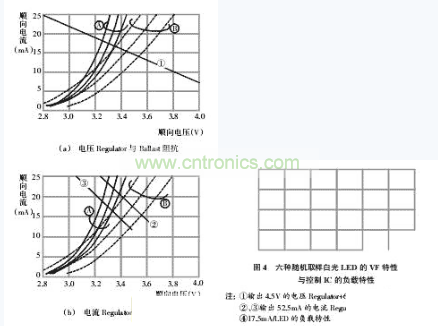 圖3是驅(qū)動白光LED常用的四種電源電路;圖4是上述六種隨機取樣白光LED穩(wěn)定后的ReguLation精度特性。