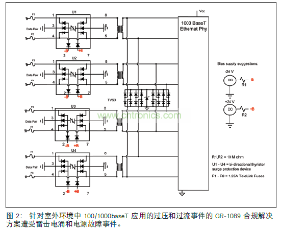 數(shù)據(jù)對(duì)導(dǎo)線中的保險(xiǎn)絲提供必要的過流保護(hù),對(duì)一級(jí) GR-1089 事件的雷擊引起的過壓電涌不敏感。 雙向半導(dǎo)體晶閘管電涌保護(hù)設(shè)備 IC1 至 IC4 或 SIDACtor設(shè)備(參見圖3.)提供過壓消弧保護(hù)方法,根據(jù) GR-1089 第 6 版,這種方法符合一級(jí)和二級(jí)雷擊電涌。