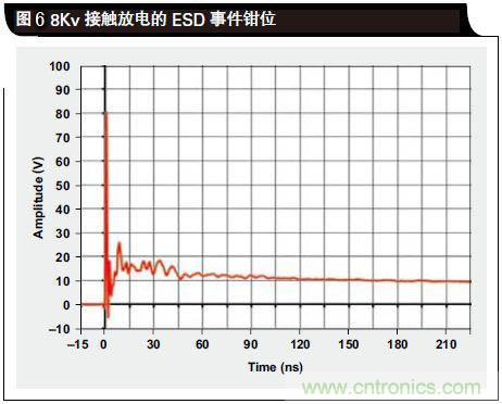 把鉗位電壓波形下面的區(qū)域想像成能量。鉗位性能越好,受保護(hù)ESD敏感型器件在ESD事件中受到損壞的機(jī)率也就越小。由于鉗位電壓很小,一些TVS可承受IEC模型的8kV接觸式放電,但是“受保護(hù)”器件卻被損壞了。