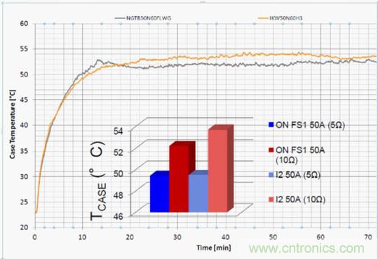 安森美半導體的客戶已成功使用其場截止型第一代IGBTNGTB50N60FLWG開發(fā)出了各種應用,如功率10 千伏安、功率因數(shù)0.9的不間斷電源,以及采用半橋諧振拓撲結構的1450瓦廚用電爐??蛻粽J為,安森美半導體場截止型第一代IGBT的性能達到了市場上最好的性能;其IGBT在電磁爐上的溫升低于其它2款IGBT。