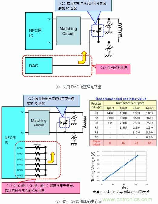 第二, 如圖2(b)所示,從NFC用IC等GPIO端口生成控制電壓來調整靜電容量。GPIO是General Purpose Input/Output的簡稱,是IC芯片提供的輸出端子的一種。特定用途和信號尚未明確,但可以根據(jù)軟件指令進行任意的輸出變化。比如說,軟件指示為輸入“0”的話則為0V,指示為輸入“1”的話則有可能會執(zhí)行輸出3V的操作。如果利用GPIO的輸出端子的話,如果收到的是0V、3V這兩個值的輸出信號,那么執(zhí)行的操作就是通過2n的電子元件的組合來實現(xiàn)合成2n的阻抗電壓。