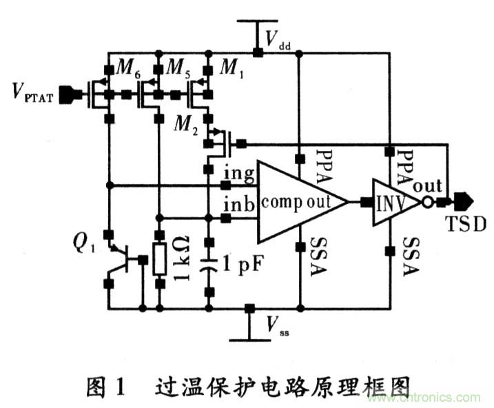 圖1為本設(shè)計(jì)的原理架構(gòu),Q1為NWELLCMOS工藝中寄生PNP三極管,其集電極是必須與地點(diǎn)位連接,為了利用寄生PN結(jié)導(dǎo)通正向?qū)妷旱呢?fù)溫度特性,把Q1做二極管連接(基集也接到地),這樣A點(diǎn)和地之間的電壓VA就具有了PN結(jié)正向電壓的與溫度成反比的性質(zhì)。由于基準(zhǔn)電路輸出的偏置電壓加在M0、M1、M5的柵極上,則其所在支路上都會(huì)產(chǎn)生PTAT電流(Proportional to Abso-lute Temperature);在提供偏置的同時(shí),也在電阻R0上產(chǎn)生了與溫度成正比的電壓VB即B點(diǎn)電壓隨之增大。當(dāng)達(dá)到某一溫度TH(設(shè)定的關(guān)斷溫度)后,VH≥VA、比較器Comp輸出高電平,經(jīng)過倒相器INV后,輸出TSD為低電平;此信號(hào)作用于電路的其它模塊后,使整個(gè)芯片停止工作,實(shí)現(xiàn)熱保護(hù)功能。同時(shí),TSD信號(hào)正反饋?zhàn)饔糜贛2柵上,開啟M2,加大了電阻R0上電流,使VB更高。