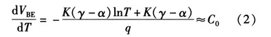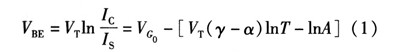 式中VG為帶隙電壓,γ和α為器件參數(shù),A代表了那些方程推到過程中與溫度無關(guān)的常量。因?yàn)閂t=kt/q,可以得到VBE隨溫度上升是降低的。其關(guān)于溫度變化的方程為