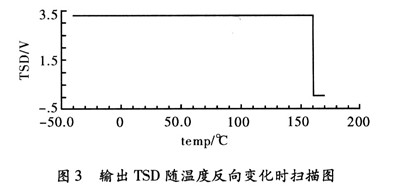 按照以上設(shè)計(jì)的電路。用Cadence Specture對(duì)其進(jìn)行仿真,器件的模型參數(shù)采用0.35μm CMOS工藝。圖2為過溫保護(hù)電路的輸出控制信號(hào)TSD,隨溫度上升和下降的曲線。電源電壓取3.3 V。從仿真結(jié)果可以看出,該電路實(shí)現(xiàn)了良好的“溫度遲滯”特性。遲滯功能有效的避免了芯片出現(xiàn)熱振蕩問題。關(guān)斷溫度TH160°和恢復(fù)溫度TL140°。