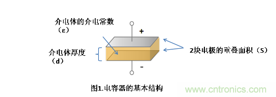 電容器用于儲存電荷,其最基本結(jié)構(gòu)如圖1所示,在2塊電極板中間夾著介電體。