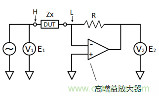 DUT為Device Under Test的縮寫(xiě),指測(cè)量對(duì)象。高增益放大器會(huì)自動(dòng)調(diào)整增益,使通過(guò)電阻R的電流與通過(guò)DUT的電流相等,DUT 的低電位側(cè)(圖中L一側(cè))一直處于虛擬接地(電位=0)狀態(tài)。此時(shí)的輸入電壓E1及輸出電壓E2能測(cè)出相位角,如下所示。