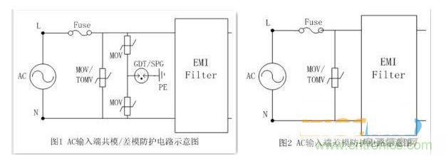 在交流電源AC輸入端浪涌保護(hù)方案,可以采用壓敏電阻(MOV) 或加氣體放電管(GDT/SPG)組合來(lái)進(jìn)行設(shè)計(jì)。在有接地的情況下,可以采用如圖1差共模同時(shí)防護(hù)的理念,在L-N之間并聯(lián)壓敏電阻(MOV),可以有效地抑制差模所產(chǎn)生的浪涌過(guò)電壓,起到對(duì)后級(jí)