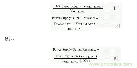 利用[12]式,可計算出RBISTABLE為0.320Ω。方程[9]的圖形表明,電源效率隨著RS的增加而跌落,在RS = RBISTABLE時跌落達(dá)20%。注意:該結(jié)論并不具有普遍性,對于每個應(yīng)用,必須分別進(jìn)行計算。RS的來源之一,是所有電源無法避免的、有限的輸出電阻,它可通過負(fù)載調(diào)整來確定,后者通常定義為: