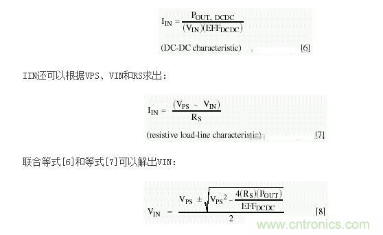 從該方程很容易得到能量損耗,并且圖3分析曲線中的有關(guān)參數(shù)也可以從中得到。舉例來說,如果串聯(lián)電阻(RS)等于零,電阻負(fù)載線的斜率將會變?yōu)闊o窮大。那么負(fù)載線就成為一條通過VPS的垂直線。在此情況下,VIN+ = VPS,效率為100%。隨著RS從0Ω增加,負(fù)載線繼續(xù)通過VPS,但越來越向左側(cè)傾斜。同時,VIN+和VIN-匯聚于VPS/2,這也是50%效率點(diǎn)。當(dāng)負(fù)載線相切于I-V曲線時,方程[8]只有一個解。對于更大的RS,方程沒有實(shí)數(shù)解,DC-DC轉(zhuǎn)換器將無法正常工作。