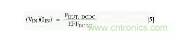 現(xiàn)在,我們有了足夠的信息來計算電源自身的耗散功率及其效率。因?yàn)殡娫措妷旱拈_路值(VPS)已經(jīng)給出,我們僅需找出DC-DC轉(zhuǎn)換器的輸入電壓(VIN)。從等式[5]解出IIN: