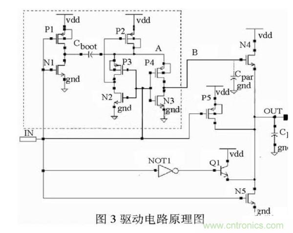 圖3中給出了驅(qū)動電路的電路圖。驅(qū)動電路采用Totem輸出結(jié)構(gòu)設(shè)計(jì),上拉驅(qū)動管為NMOS管N4、晶體管Q1和PMOS管P5。下拉驅(qū)動管為NMOS管N5。圖中CL為負(fù)載電容,Cpar為B點(diǎn)的寄生電容。虛線框內(nèi)的電路為自舉升壓電路。