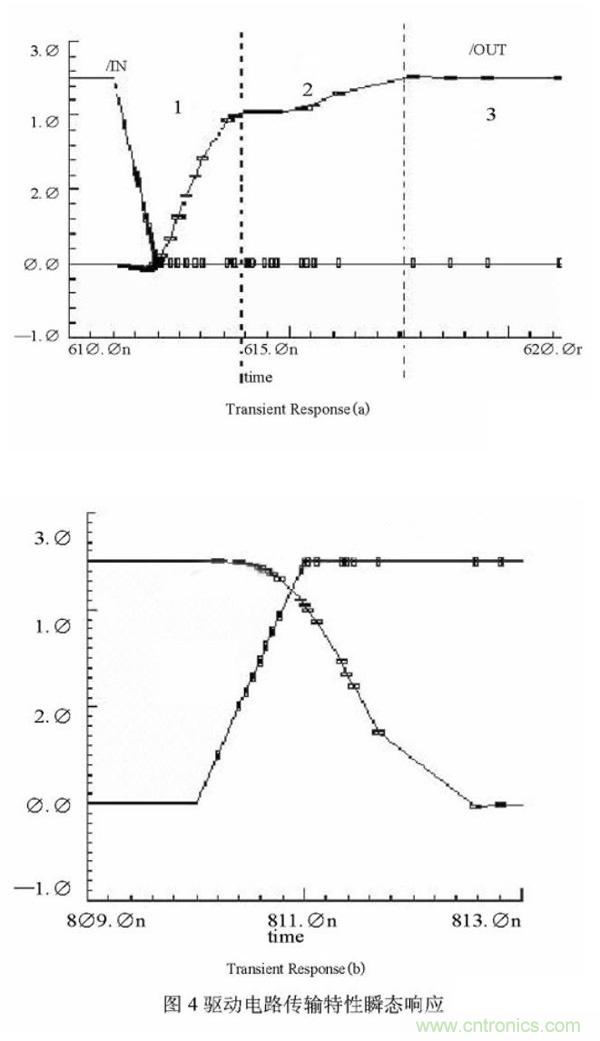驅(qū)動電路的傳輸特性瞬態(tài)響應(yīng)在圖4中給出。其中(a)為上升沿瞬態(tài)響應(yīng),(b)為下降沿瞬態(tài)響應(yīng)。從圖4中可以看出,驅(qū)動電路上升沿明顯分為了三個部分,分別對應(yīng)三個上拉驅(qū)動管起主導(dǎo)作用的時(shí)期。1階段為Q1、N4共同作用,輸出電壓迅速抬升,2階段為N4起主導(dǎo)作,使輸出電平達(dá)到VDD,3階段為P5起主導(dǎo)作用,維持輸出高電平為VDD。而且還可以縮短上升時(shí)間,下降時(shí)間滿足工作頻率在兆赫茲級以上的要求。