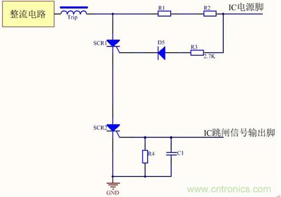 斷路器三相同時通電時,經(jīng)過全橋整流之后加在可控硅兩端的直流電壓超過500V,對單個可控硅的參數(shù)要求非常高,目前主流產(chǎn)品都是采用雙硅串聯(lián)的電路,以此降低單個可控硅兩端的直流電壓,提高可控硅觸發(fā)電路的可靠性和穩(wěn)定性?,F(xiàn)有技術(shù)采用的雙硅串聯(lián)電路如下圖所示,只是簡單的把兩個可控硅串聯(lián)起來,當(dāng)漏電IC芯片檢測到漏電信號達(dá)到跳閘閾值時,跳閘信號輸出引腳輸出高電平,可控硅SCR2觸發(fā),繼而可控硅SCR1觸發(fā),從而使得漏電斷路器線圈脫扣。