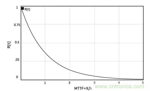 這是因?yàn)?,具有恒定故障率的故障由一個(gè)指數(shù)因子表征,如以下等式所示,用于計(jì)算元器件在給定時(shí)間后沒有發(fā)生故障的可能性:R(t) = e-λt