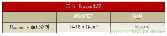 • 較低的RDS(on):如表1所示,GaN的MOSFET面積為RDS(on)的一半。這直接使電路中傳導(dǎo)損耗降低了50%。因此,您可以在設(shè)計(jì)中使用較小的散熱器和更簡單的熱管理。