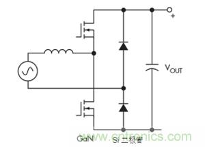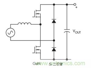 一種替代方案是連續(xù)導(dǎo)通模式圖騰柱拓?fù)?。這種拓?fù)浣Y(jié)構(gòu)充分利用了GaN的所有關(guān)鍵特性,最終導(dǎo)致尺寸更小、工作頻率更高的設(shè)計(jì)(圖4)。GaN的零反向恢復(fù)對于實(shí)現(xiàn)該拓?fù)涮貏e重要。