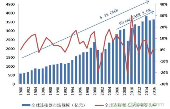 這是因為全球連接器市場已經(jīng)連續(xù)近40年來持續(xù)增長,據(jù)Bishop&Associate數(shù)據(jù),全球連接器市場從1980年的594億元增長到2016年的3643億元,復(fù)合增長率高達5.2%,近十年來增速放緩,復(fù)合增長率為2.6%。從年度來看2016 年全球連接器市場達到 544 億美元,同比增長 4.5%,依然保持穩(wěn)健成長的態(tài)勢。中國市場表現(xiàn)更優(yōu),增速約為全球市場增速 2 倍,同比增長10%,達到159.4億美元,占全球比例接近30%,遠高2010年的 20%。雖然全球連接器市場2014年之后出現(xiàn)暫時性下滑,但隨著中國經(jīng)濟觸底反彈以及智能化升級,必將繼續(xù)帶動這一產(chǎn)業(yè)向前快速發(fā)展。